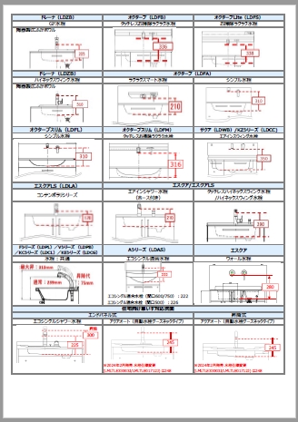 ハンドシャワータイプの水栓をお選定頂きますと、汲む(くむ)作業がしやすくなります。※ハンドシャワータイプの設定が無いシリーズもございますので、必ずカタログ等でご確認ください。また、水栓の吐水部からボウル底面までの寸法は以下資料をご参照願います。(寸法は良く相談のあるシリーズを選定しております) ※図をクリックすると大きくなります。