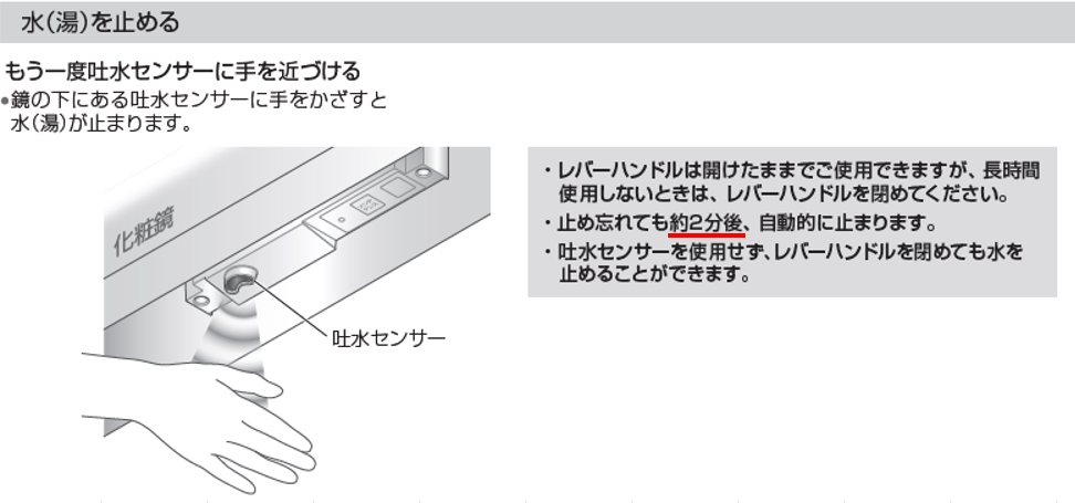 センシングシステム付き水栓は手かざし吐水後、自動でとまりますか?何分で止まりますか?