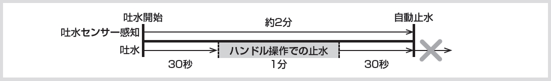 自動で止まります。2分で止まります。■取扱説明書から抜粋・連続吐水時間は吐水センサー感知から約2分間です。 連続吐水時間中にハンドル操作で吐止水してもタイマーはリセットされません。