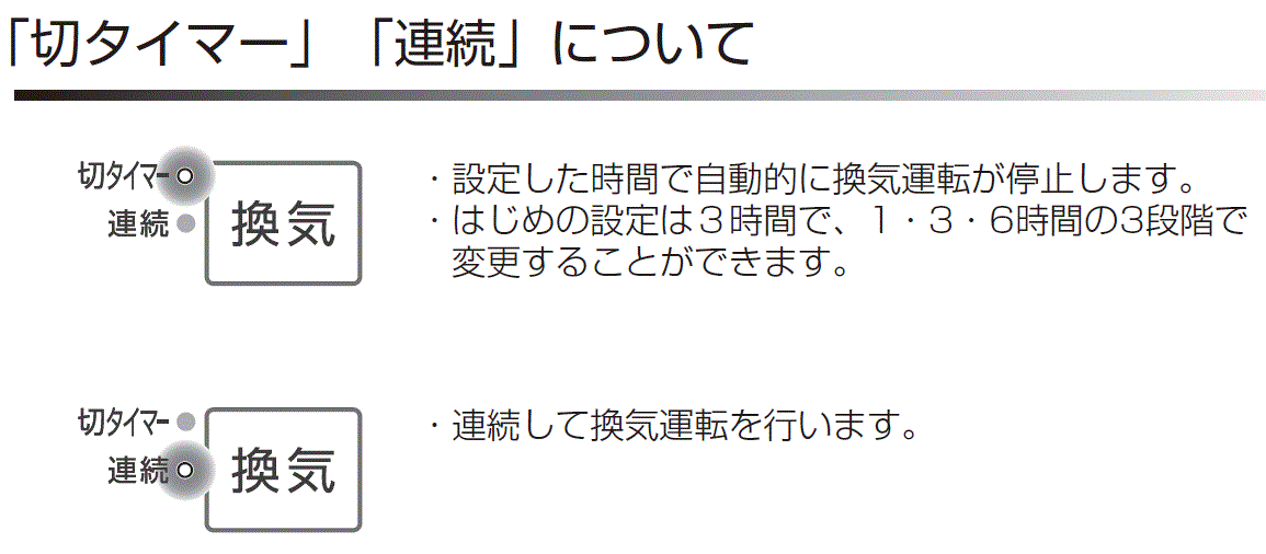 1) 換気スイッチ1回押すごとに「切タイマー」「連続」に切り替わります。
