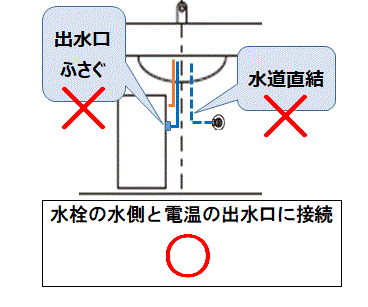 ①給水のみを直接水栓金具に接続すると、湯側のみが減圧されるため、湯水の圧力バランスが悪くなり、温度調節などの使い勝手が悪くなります。