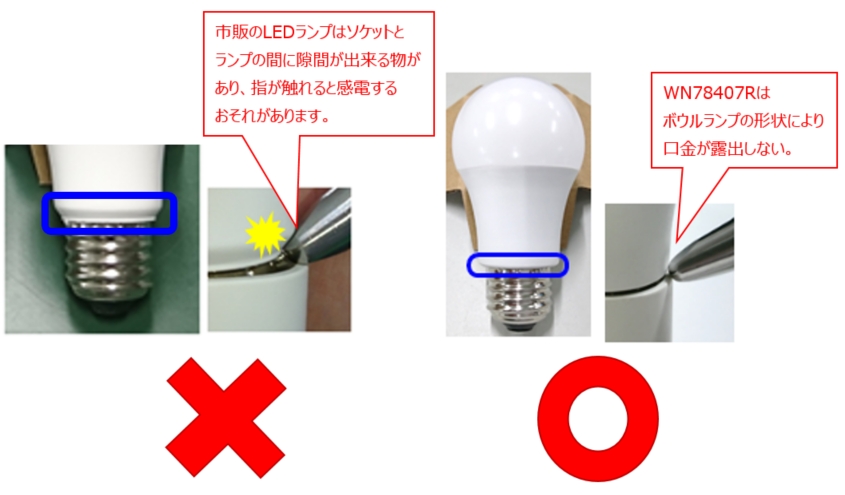 WN78407Rは口金部の形状がソケットとの隙間ができにくい形状をしており、口金部に指が触れて感電するおそれが無いため。