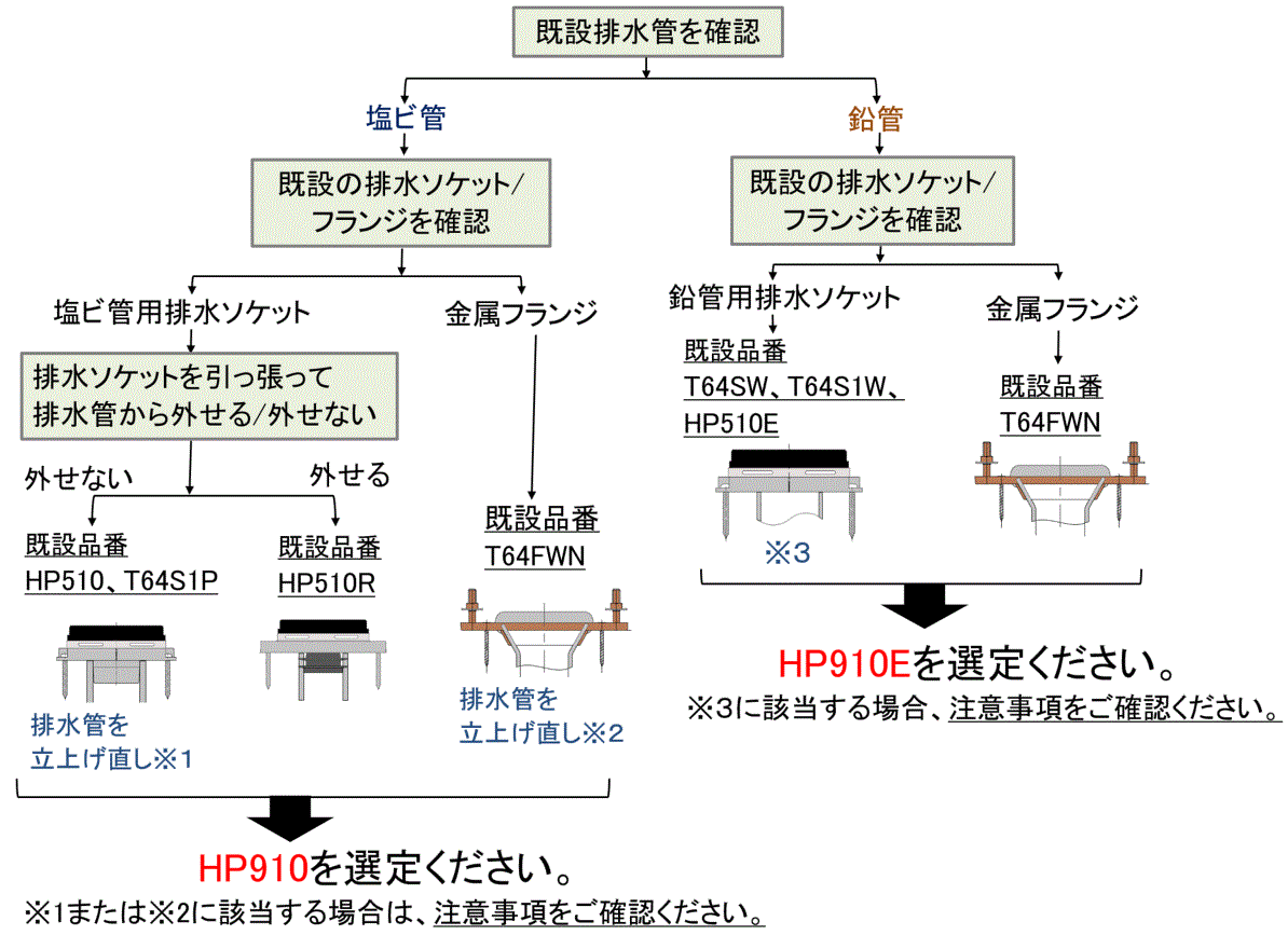 既設排水管の材質や、排水ソケット/フランジの仕様を下図のフローに沿って確認いただき、